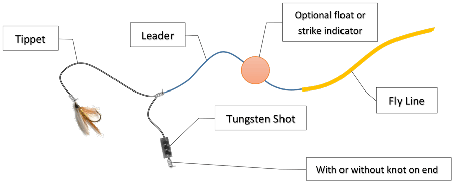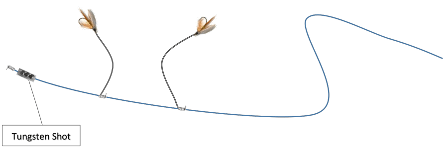 Fly Fishing Opt. 2 using a dropper to attach weight. With or without a knot on the end of dropper. The knot will make it harder to displace shot when snagged.